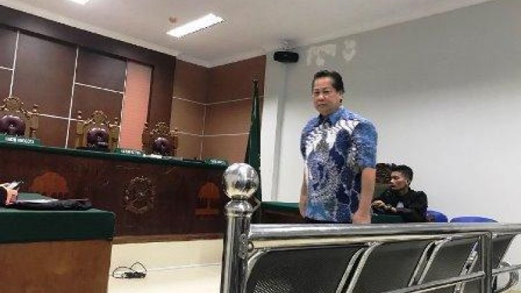 Suasana di ruang sidang pun hening menjelang majelis hakim datang, Tahir yang sudah berada di dalam terlihat santai.