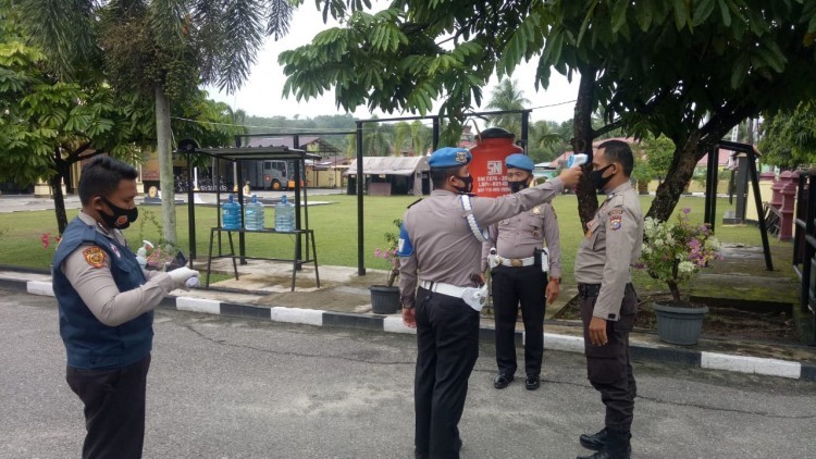 Pemeriksaan personel yang memasuki lingkungan Mapolres ini meliputi pengecekan suhu tubuh, wajib menggunakan masker, mencuci tangan pada tempat yang telah disediakan disekitar gerbang pintu masuk, serta penerapan phisical distancing atau jaga jarak dengan siapapun saat berada di lingkungan Mapolres.