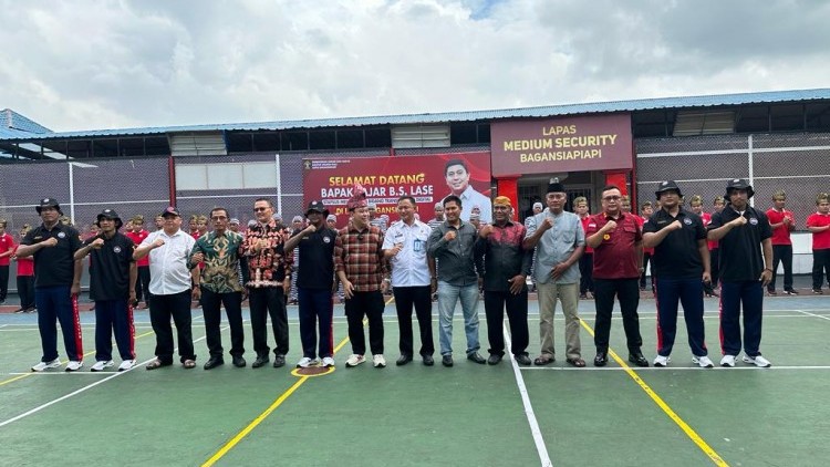 KANALSUMATERA.com - BAGANSIAPIAPI - Staf Khusus Menteri Hukum & HAM (Menkumham) RI Bidang Transformasi Digital Fajar B.S Lase menyapa para Warga Binaan Pemasyarakatan (WBP) di Lembaga Pemasyarakatan (Lapas) Kelas II A Bagansiapiapi, Rabu (12/7/2033).