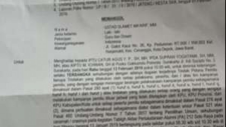 "Untuk: Menghadap IPTU Catur Agus Y.P., SH, MH, Ipda Supran Yogatama, SHJ, MM, MH, atau Aiptu M. Ichwan, SH di Posko Gakkumdu Polres Surakarta Jl. Adi Sucipto No.2 Surakarta pada hari Rabu tanggal 13 Februari 2019 pukul 10.00 WIB, untuk dimintai keterangan selaku tersangka," demikian bunyi surat panggilan pemeriksaan Slamet Maarif yang diterima redaksi, Minggu (10/2).